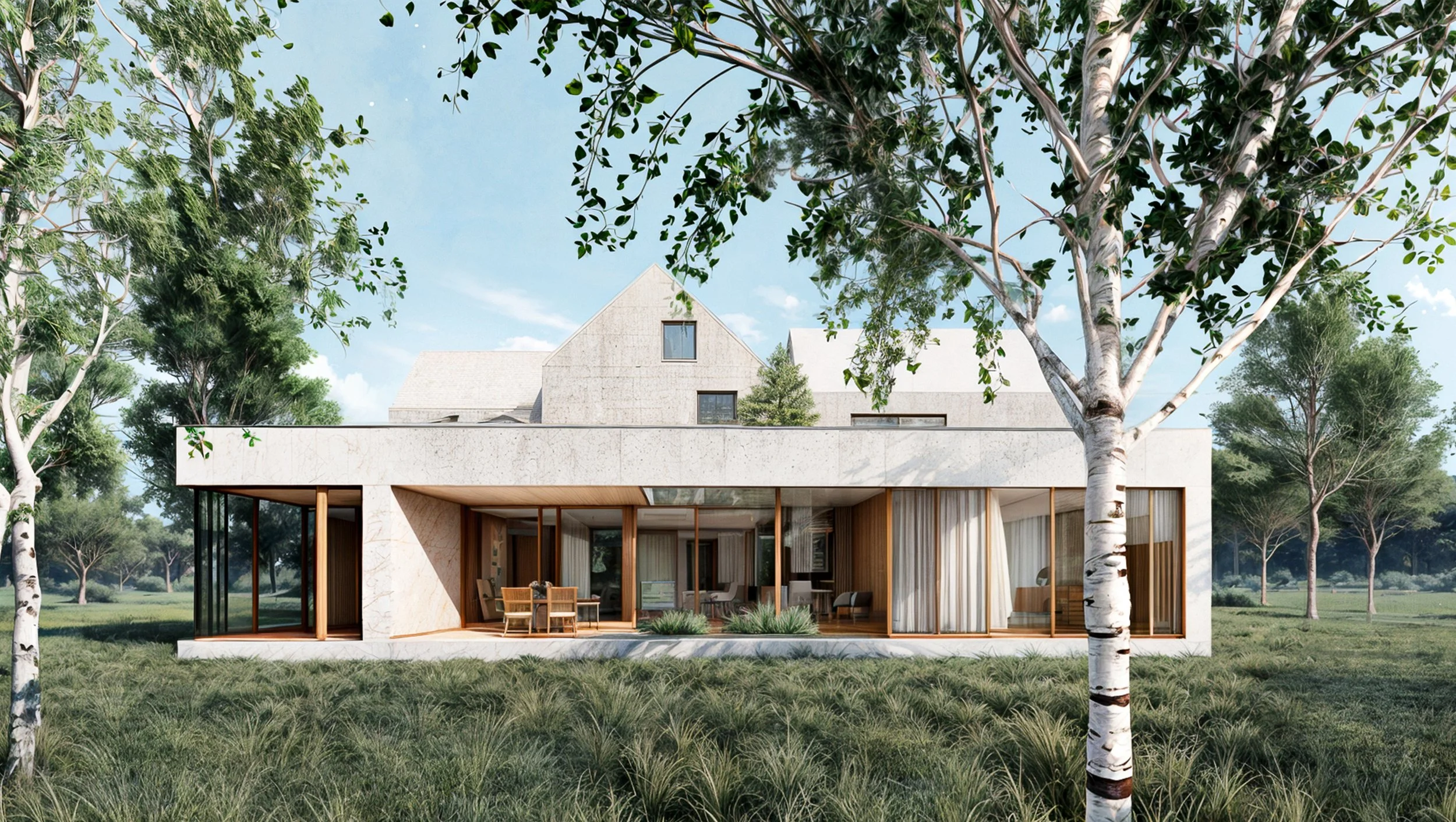 Tu kamień spotyka brzozę, a dachy unoszą się ku niebu, niczym wyciągnięte ku światłu ramiona. Tu życie toczy się między ziemią a niebem, między wnętrzem a zewnętrzem, między codziennością a poezją. To dom, który nie tylko stoi między brzozami, ale staje się ich częścią.